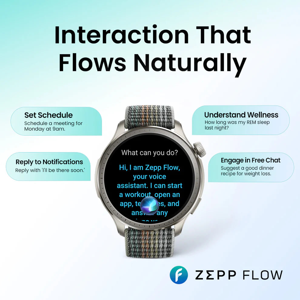 - Integrated Zepp Flow™ AI assistant for voice control, personalized AI fitness coaching, and health analysis.